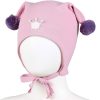 Myk vårlue med to runde dusker. Luen dekker ørene godt, har windstopper, knyting under haken og rev i pannen.