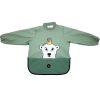 Superpraktisk langermet smekke som holder enda mer søl unna! Smekken som har hals slik at alt søl holdes på utsiden av smekken! Kan brukes fra den første matbit introduseres og frem til barnet spiser selv uten å søle. Materialet på halsen er lik som resten av smekka, noe som gjør det enkelt å skylle av den, og den tørker på null komma niks. Med de lange armene kan barnet fullt ut få utfolde seg ved matbordet, og strikket rundt håndleddet stopper maten fra å lure seg inn til armen.