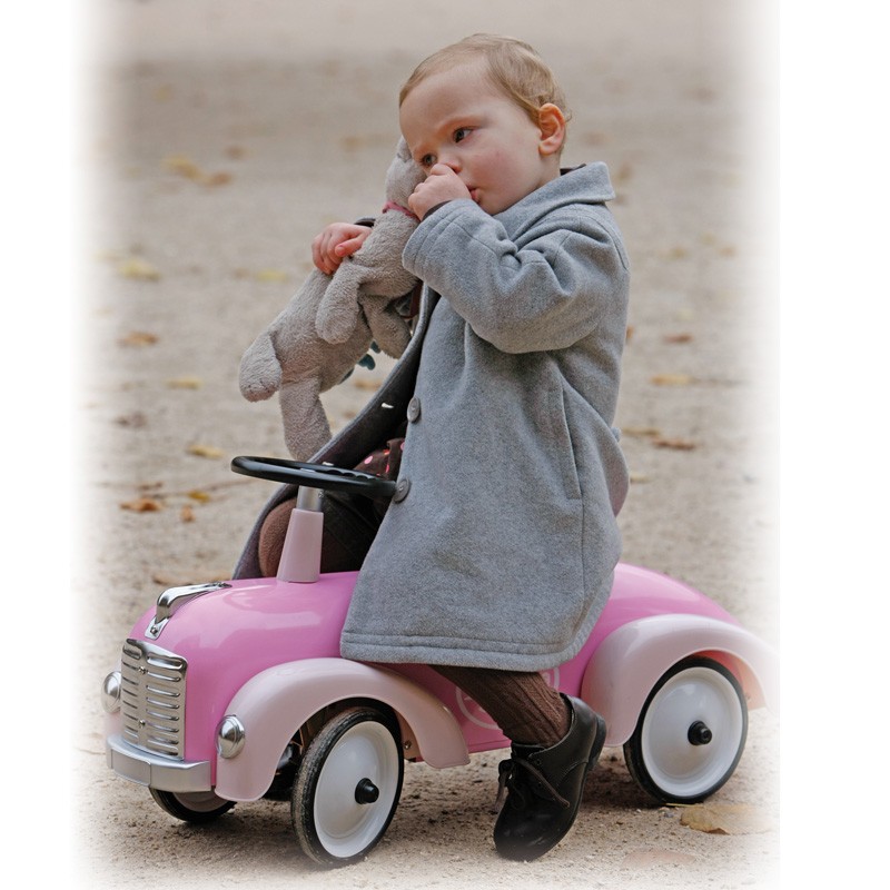 Superkul nostalgisk gåbil i lakkert metall. Gummidekk gjør at den passer like godt inne som ute, karosseri og styresystem er i metall. Svingbart ratt med horn. Denne bilen dytter du igang med føttene. Den perfekte gaven til jul, dåp/navnedag, bursdag osv.! Kommer umontert.
