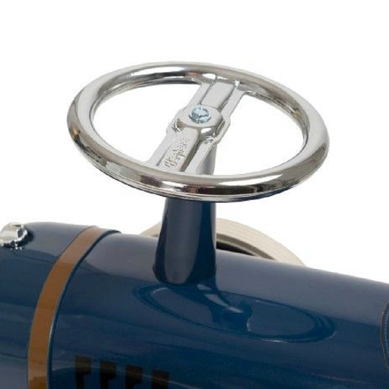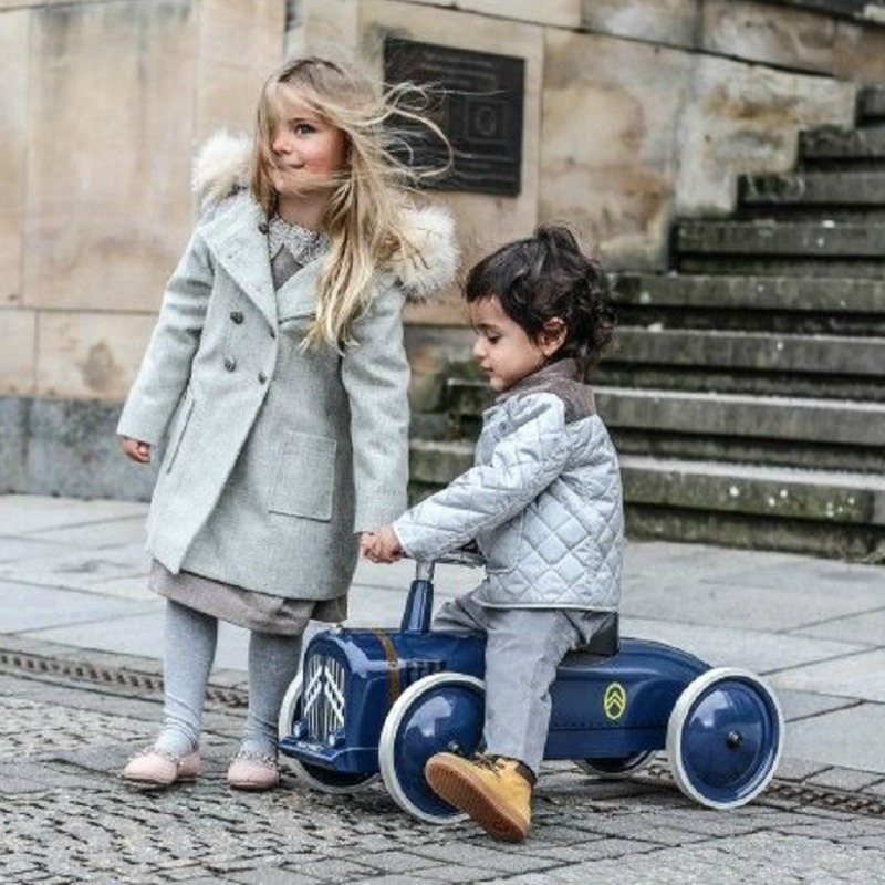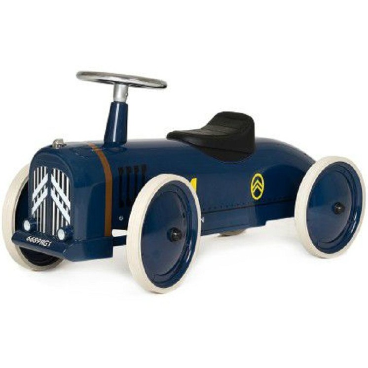 Superkul nostalgisk gåbil i lakkert metall designet i samarbeid med Citröen. Gummidekk gjør at den passer like godt inne som ute, karosseri og styresystem er i metall. Svingbart ratt med horn. Denne bilen dytter du igang med føttene. Den perfekte gaven til jul, dåp/navnedag, bursdag osv.! Kommer umontert.