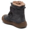 Vannavvisende vinterstøvel i skinn med ullfor og en fleksibel såle. De pustende, temperaturregulerende materialene holder føttene tørre og varme vinteren gjennom. Støvlene har et mellomlangt skaft og lukkes med borrelås. Skinnet er vegetabilsk garvet, fritt for kjemikalier, krom og metaller.