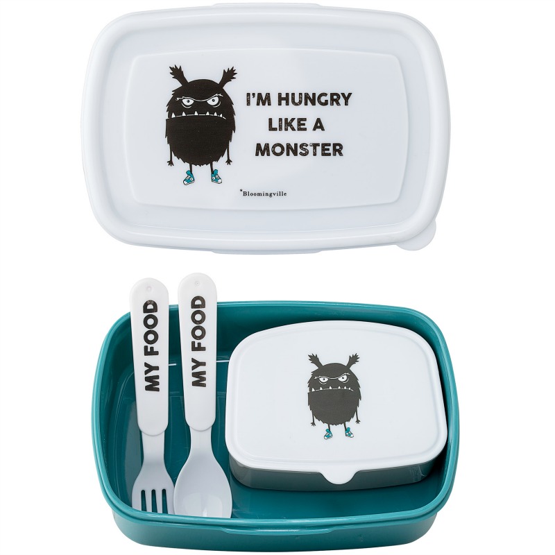 Artig matboks med monster, uttagbar boks med lokk og bestikk.