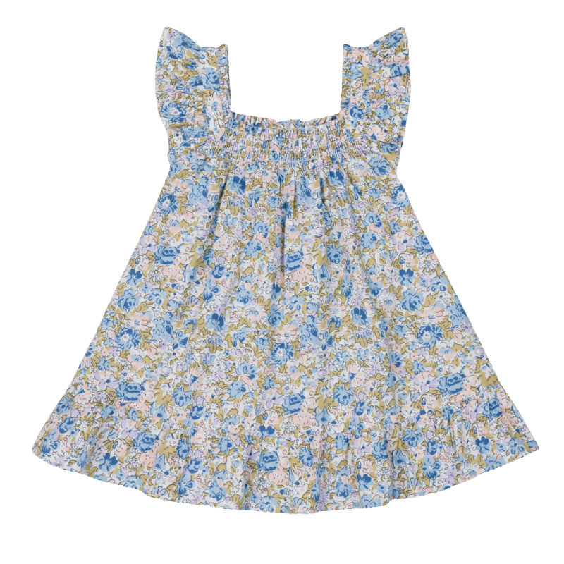 The Poplin Dress is cut in our soft and crisp GOTS certified cotton quality. It has a down to the knee length, volume in the skirt and short sleeves with frills. The dress has a squared neckline made of elastic smocking.