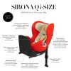 Den nye Cybex Sirona Q i-Size er den samme Sironaen vi kjenner og elsker, bare bedre! De nye i-Size forskriftene sier at barn opp til 15 måneder MÅ sitte bakovervendt, og i nye Sirona Q i-Size kan barnet sitte bakovervendt helt opp til 105 cm (ca 4 år). Sirona Q i-Size monteres enkelt i bilens ISOFIX-system, og støttebenet hjelper til med å absorbere kraften i en kollisjon og gir ytterligere stabilitet. Det nye, intelligente designet betyr at selv større barn har god benplass bakovervendt. Sirona Q i-Size kan enkelt installeres i mindre biler, en-hånds hvilestilling gir ekstra komfort og gjør hverdagen enklere.