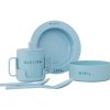 Vakkert og drop-safe servise for de minste, med alt som trengs til måltidet fra baby og opp til skolealder. Koppen kan først brukes med drikketuten og senere uten tut og håndtak, og skjeen kommer i 2 størrelser; baby og junior størrelse. Den dype tallerkenen og bollen er perfekt til babymat og senere som frokost og som snackskål når barnet er eldre. Kopp og bolle er produsert i Tritan®, bestikk og tallerken er produsert i Ecozen® – en biobasert utgave av Tritan™ basert på organisk materiale (mais). som er giftfritt og et ekstremt holdbart, resirkulerbart materiale.