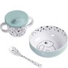Dette nydelige settet fra Done By Deer er perfekt å bruke hjemme, på reise eller et cafèbesøk. Settet inkluderer èn tutekopp, en bolle og en skje. Tutekoppen passer perfekt for å øve på å drikke av kopp, og bollen er ideell for å starte å spise.