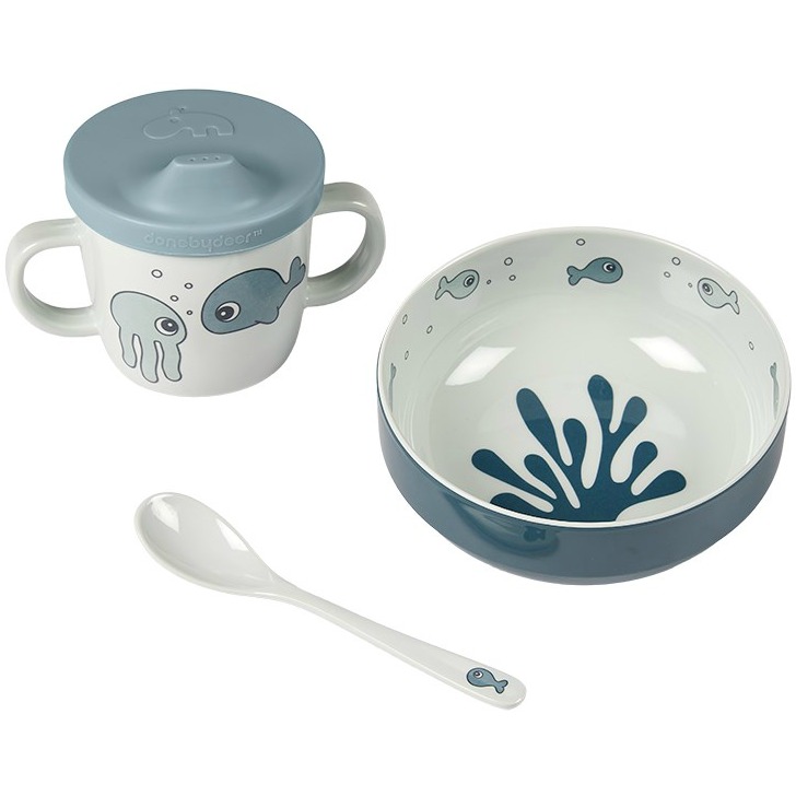 Dette nydelige settet fra Done By Deer er perfekt å bruke hjemme, på reise eller et cafèbesøk. Settet inkluderer èn tutekopp, en bolle og en skje. Tutekoppen passer perfekt for å øve på å drikke av kopp, og bollen er ideell for å starte å spise.