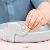 Praktisk tallerken i silikon med søte Elphee tittende opp fra kanten. Silikon har en naturlig antiskli egenskap, og skålen holder seg pent på plass oppå bordet. Buet innside gjør det enklere å samle maten oppi skjeen.