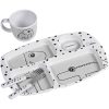 - mål: tallerken 28,5 x 19 cm, kopp: ø 8 x 6,5 cm, bestikk 14 cm.