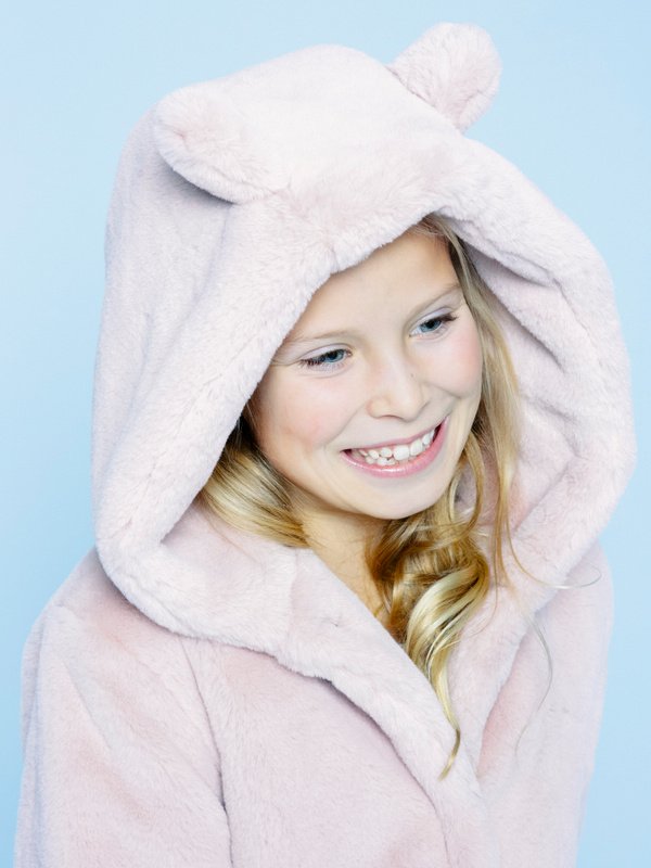 Lilly is the finest fake fur coat! It is super cute and fashionable. The jacket has hidden push-buttons in the front, but cute ears on the hood that make the jacket a favorite for young and old!
