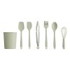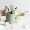 Nå kan mini hjelpe til med baking og matlaging med sine egne kjøkkenredskaper. De 6 kjøkkenredskapene i myk silikon er designet til å passe små barnehender og kan brukes til all slags matlaging og baking. Vispen har rustfri ståltråd under silikonen så barnet kan kokkelere uten å skrape opp grytene. Klypen har sklisikre håndtak og låsefunksjon. Silikonkrukken med innhold er fin å ha stående fremme på kjøkkenbenken eller på lekekjøkkenet.