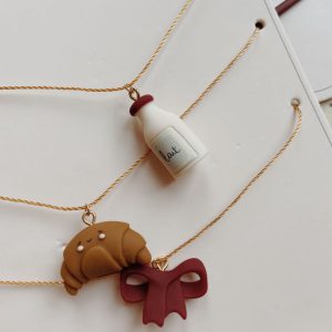 - dekorert med pompomer og printede gullprikker