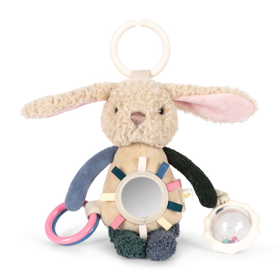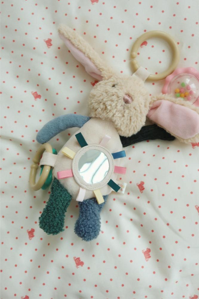 Mykt sanseleketøy med kaninmotiv – perfekt for små hender. Peluche bunny er laget med ulike teksturer og spennende detaljer som stimulerer barnets sanser.