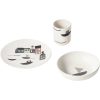 Spisesettet fra Ferm Living er laget av naturlige bambusfibre , et bærekraftig alternativ til melamin. Settet inneholder kopp, skål og tallerken som er dekorert med den finske kunstneren Hanna Konolas lekne grafiske design.