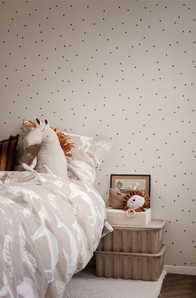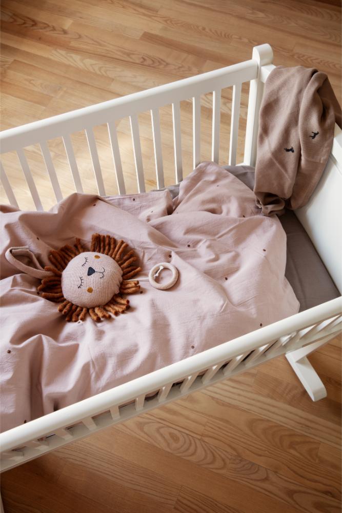 Spilledåsen er laget i naturlig lin og har dekorative frynser i ull. Den er CE-merket og godkjent for bruk fra 3 år, og passer perfekt til å henge over sprinkelseng eller stellebord.