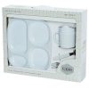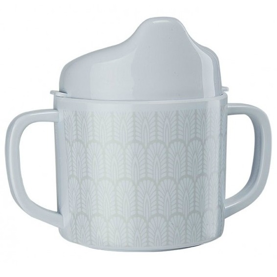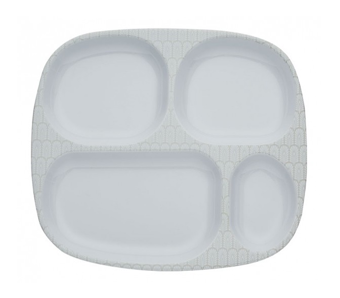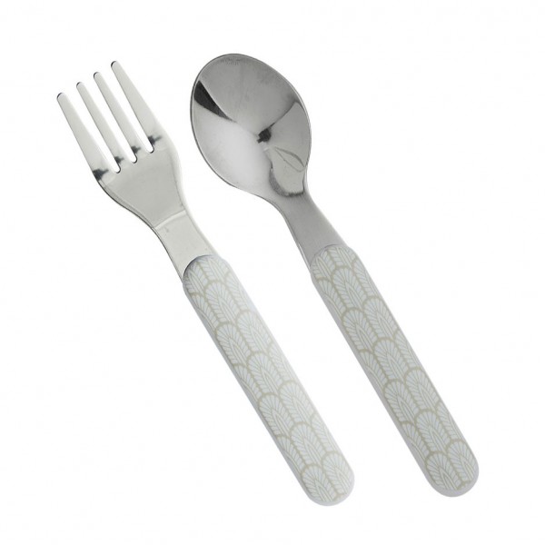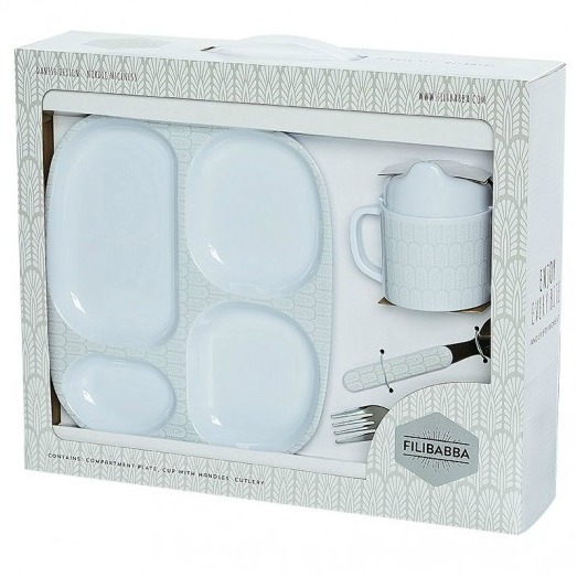 Pent spisesett i 100% melamin med 4-roms tallerken, tutekopp med to hanker og bestikk fra Filibabba. Leveres i rosa og varm grå.
