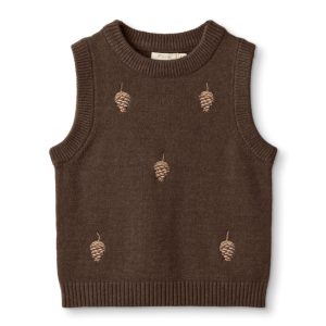 Strikket vest i myk kvalitet. Vesten har dobbelstrikket ribbekant i halskanten og vrangbord nederst og ermeåpning. I tillegg har den broderi av kongler foran.