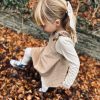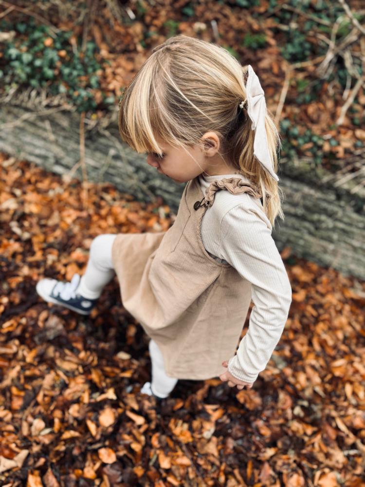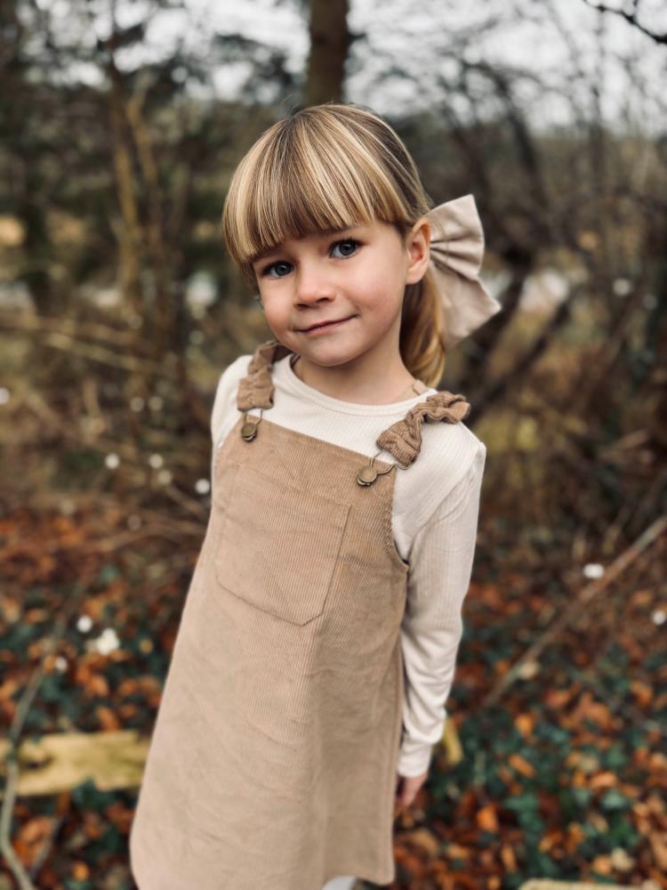 Spencerkjole i fløyel med klassisk spennelukking. Kjolen har rysj ved stroppene, noe som gir den et feminint utseende. Kjolen har en A-formet form, noe som gjør det enkelt for barnet å bevege seg i. Kjolen har en liten lomme på brystet.