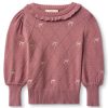 Genseren har puffede ermer med legg ved skulderen og bred ribbekant ved håndleddet, som gir en pen og komfortabel passform. Rund hals med ribbekant og en liten krage langs kanten gir et ekstra feminint og tidløst preg. Et koselig, men samtidig pyntet plagg som passer både til hverdags og finere anledninger.