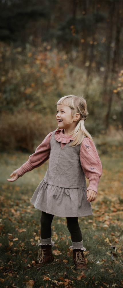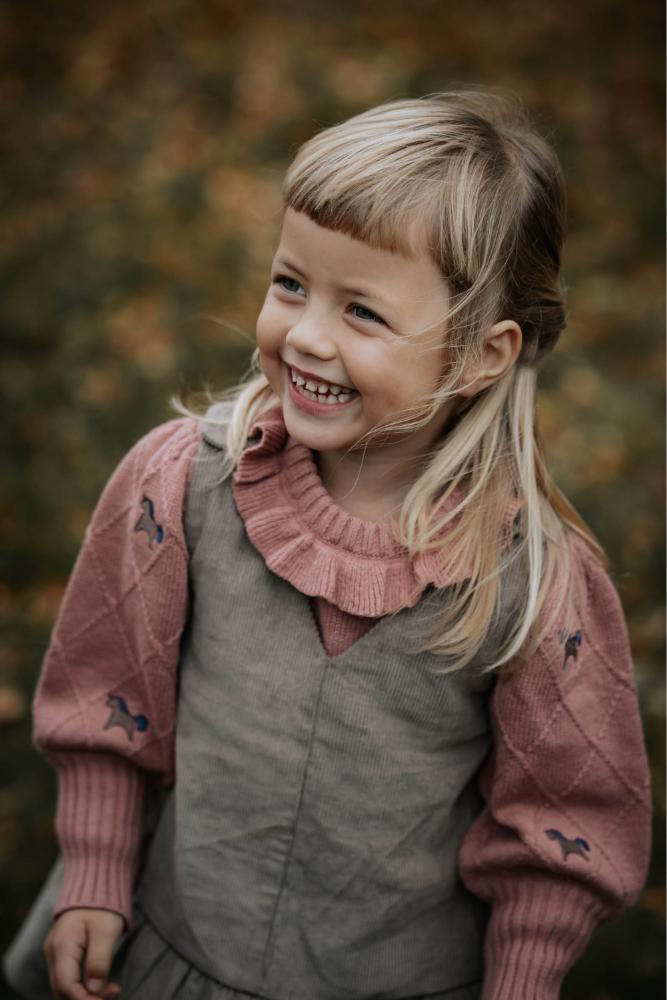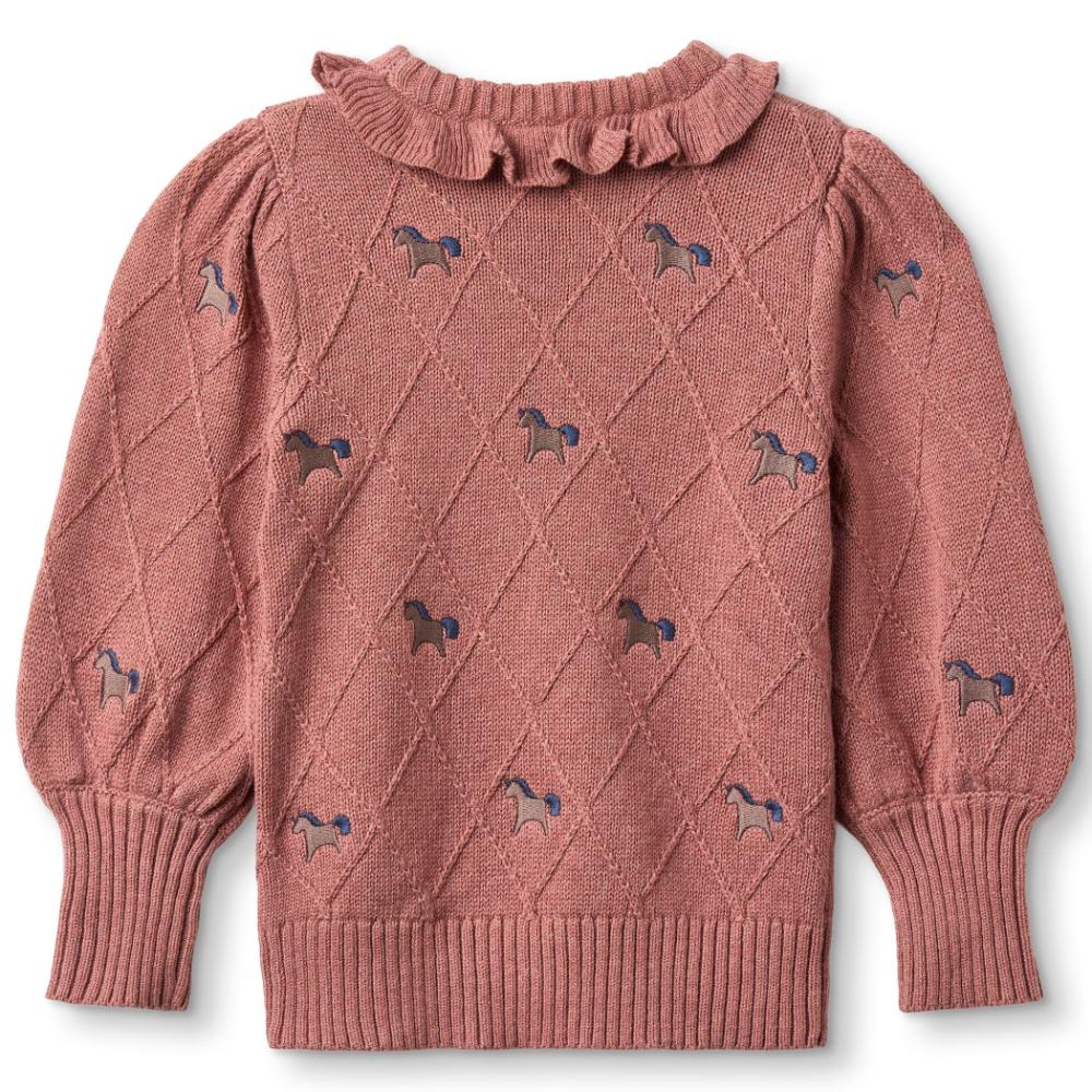 En myk og sjarmerende strikkegenser med harlequinmønster over hele kroppen og søte, broderte enhjørninger på både ermer, forside og bakside. Genseren har puffede ermer med legg ved skuldrene og høy ribbkant ved håndleddene som gir en elegant og feminin silhuett. Den runde halsen er pyntet med en liten krage som tilfører et ekstra delikat preg.
