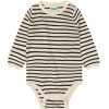 En nydelig body i ekstra fin merinoull, strikket i lett single jersey med klassiske striper. Bodyen har rund hals og er designet med perlemorsknapper på skulderen samt trykknapper nederst for enkel av- og påkledning. Perfekt kombinasjon av stil og komfort til de minste.