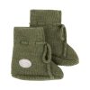 Myke babyvotter strikket i striper. Tettsittende rib-kanter som omslutter håndleddet og holder kulden ute. Babyvottene har en smart snor i endene som kan trekkes igjennom ermene på jakke eller genser så de ikke forsvinner.
