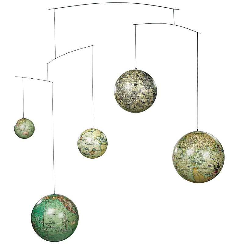 Håndlagd, nydelig, uro med 5 globuser fra 5 århundrer, som symboliserer utviklingen innen kartografi, og den gradvise flytting av grenser. En magisk uro hvor klodene beveger seg i evige sirkler. Perfekt til barnerommet! La uroen dekorere barnerommet, stuen eller soverommet. Den passer like godt til små som til store. Super gaveide!