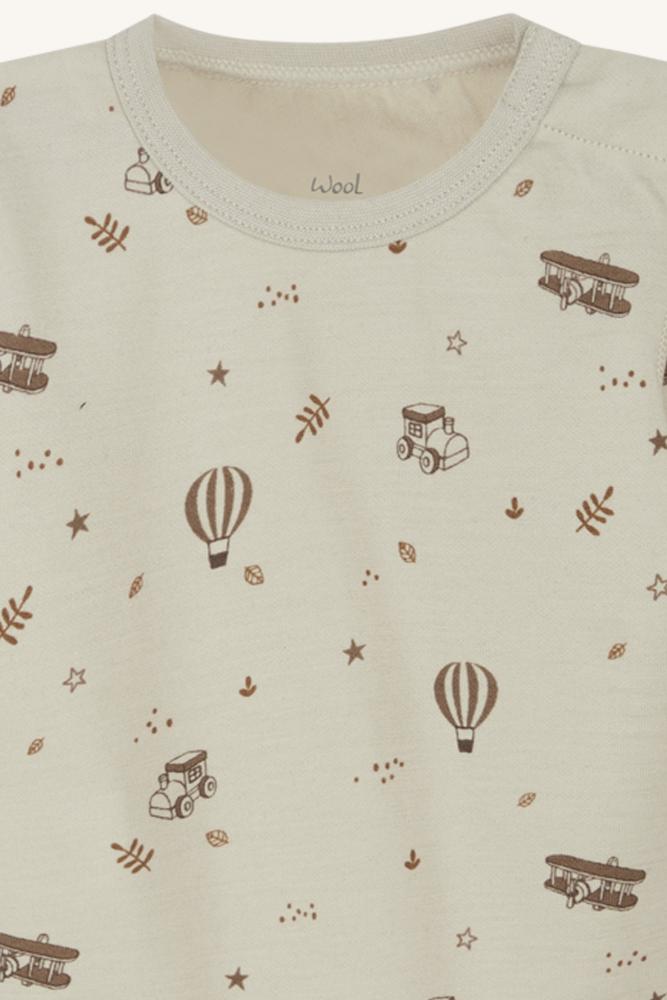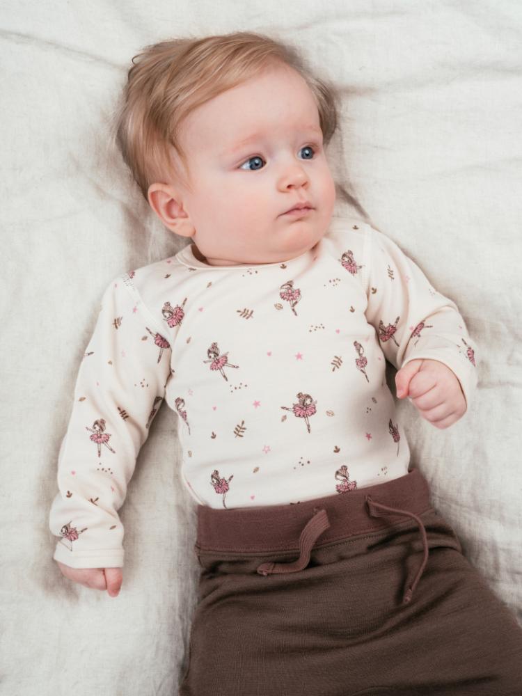 Langermet body i behagelig, elastisk ull og bambusviskose i to forskjellige design. Den ene har et trykk av luftballonger og den andre har et trykk av ballettdansere. Begge designene kneppes på venstre skulder og mellom bena. Laget av bambusviskose på innsiden og ull på utsiden. Dette produktet er Oeko-Tex 100®-sertifisert.