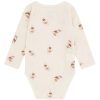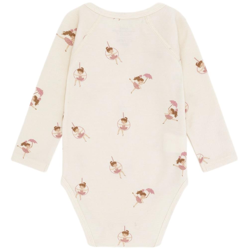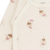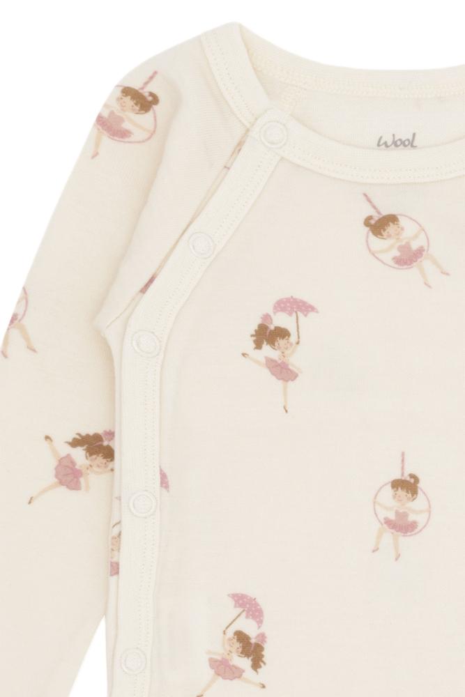 Myk og funksjonell omslagsbody med søtt danseprint fra Hust & Claire. Bodyen har praktisk omslagsåpning med trykknapper i siden og mellom bena – perfekt for de aller minste og spesielt praktisk ved bleieskift.