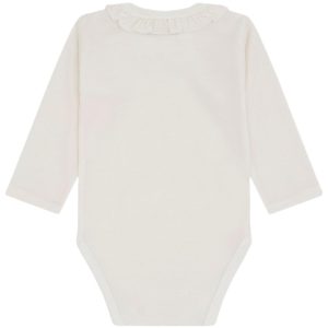 Bodyen har et delikat uttrykk med en feminin krage, som gjør den spesielt fin under kjoler eller strikkede plagg. Utsiden i ull holder barnet varmt, mens innsiden i bambusviskose gjør plagget mykt og kløfritt mot huden.