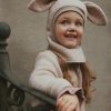 Deilig varm HUTTEliHUT elefantlue i to lag. Med søte kaninører. HUTTEliHUT-luen har en bred elastisk ribbekant i ansiktsåpningen, slik at den sitter godt og sikrer god passform. Luen har et praktisk delt design med ekstra lengde i nakken. Så barnet holder seg varmt. Elefantluen er laget av en deilig merinoullblanding med mykt velourfôr på innsiden.