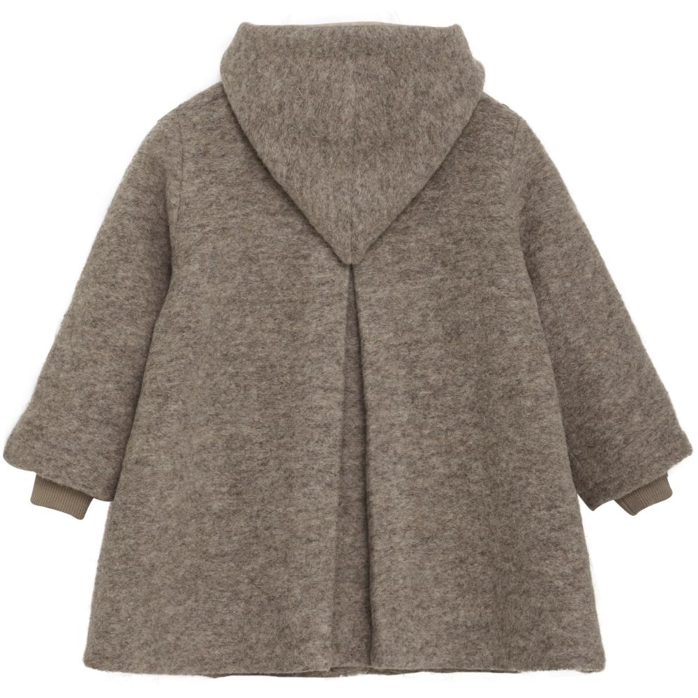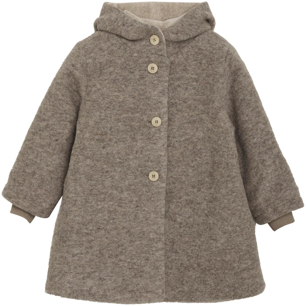 En vakker kåpe fra HUTTEliHUT i et tidløst design, perfekt til kjølige høst- og vinterdager. Jakken består av to lag og har en påsydd hette med spiss hodeform som gir et søtt og klassisk uttrykk. Den lukkes foran med fine treknapper og har praktiske lommer i sidene.