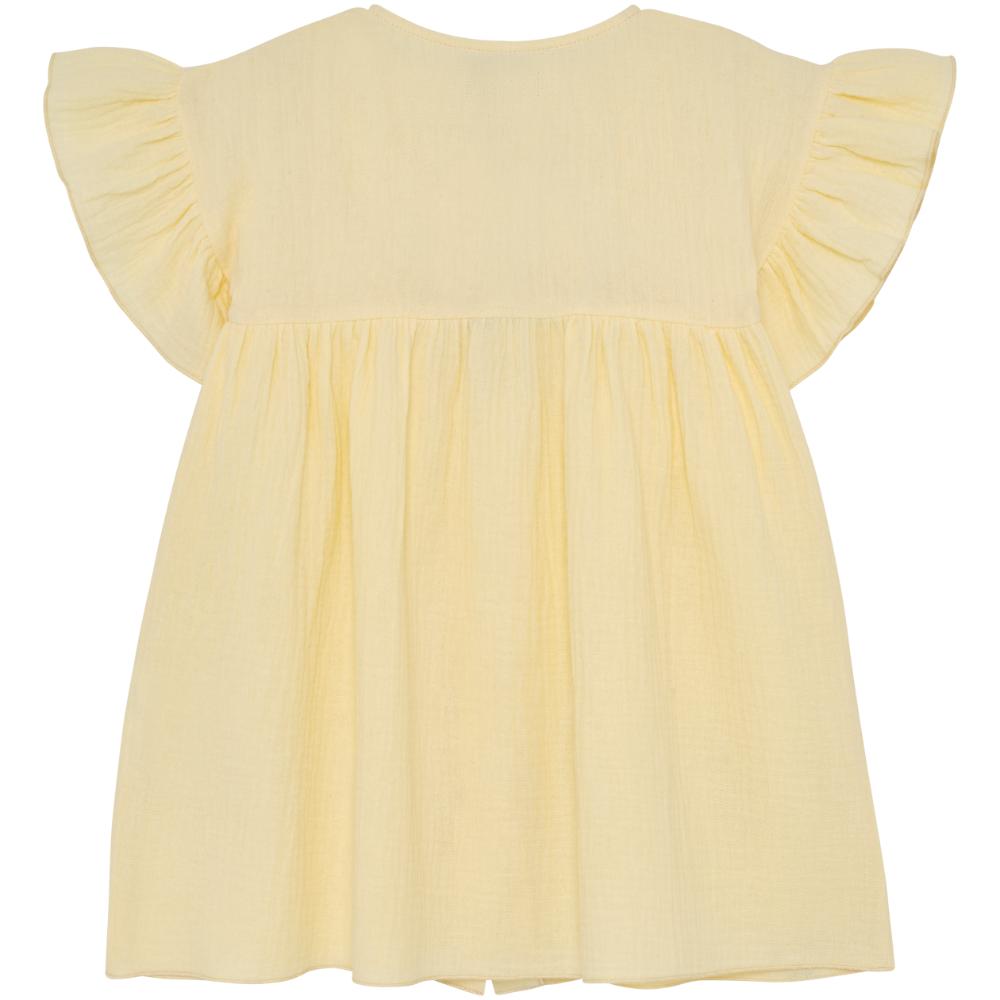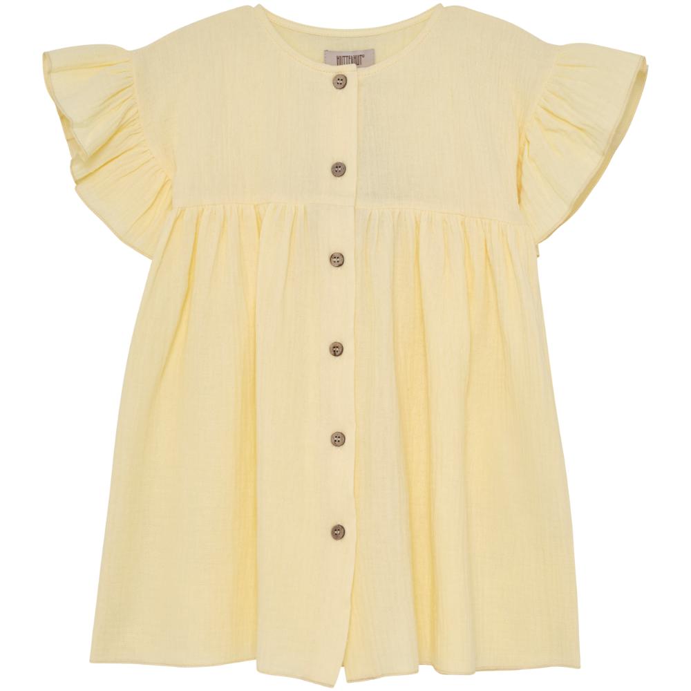 Myk og luftig kjole i bomullsmuslin med et lett og behagelig uttrykk. Kjolen har korte ermer og rynkedetaljer som gir en fin og feminin passform. Lukkes med knapper foran.