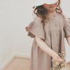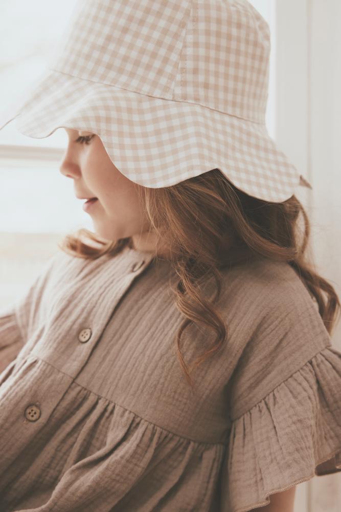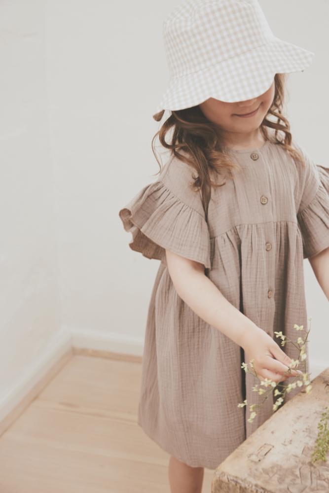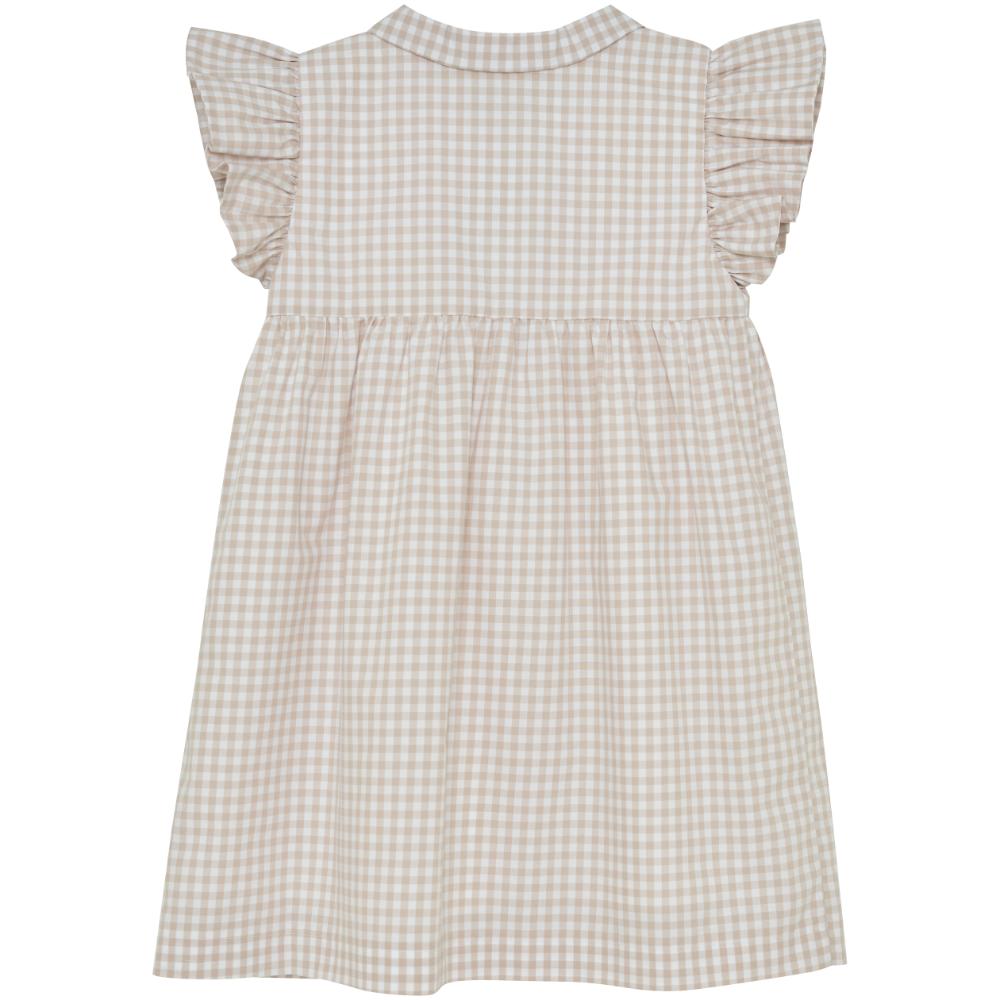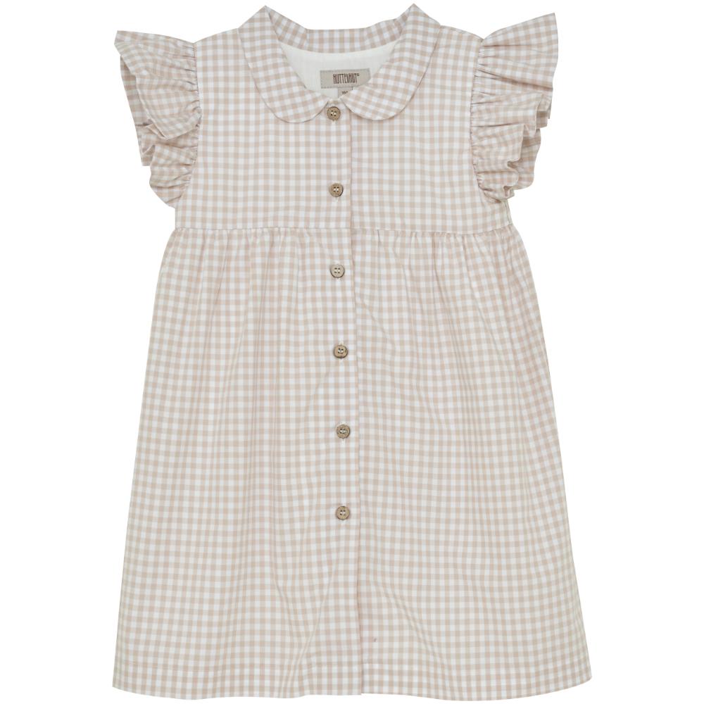 Søt sommerkjole i myk bomull med rutemønster. Kjolen har fine volangdetaljer ved ermer og krage, og åpnes foran med knapper.