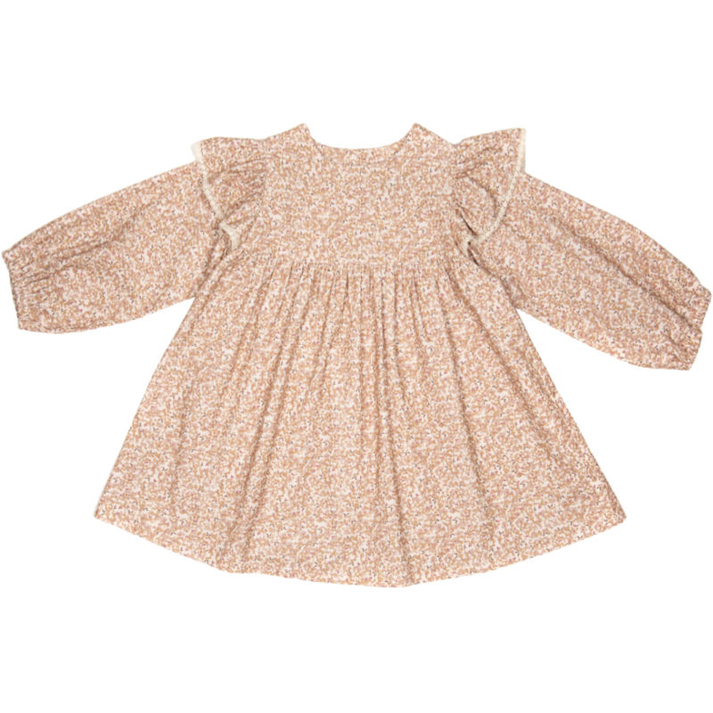 Nydelig kjole i blomsterprint med lange ermer og volanger på skuldrene. Kjolen har elastikk rundt ermene.