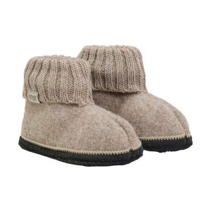 Nydelige og varme tøfler fra Huttelihut, laget i en kraftig ullkvalitet som holder små føtter gode og varme. Tøflene har dobbelt lag ribbestrikk ved ankelen som sikrer god passform og gjør at de sitter trygt på foten. Den slitesterke bunnsiden i ull gir ekstra holdbarhet.