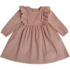 Nydelig kjole i babycord med lange ermer og volanger på skuldrene. Kjolen har elastikk rundt ermene.
