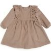 Nydelig kjole i babycord med lange ermer og volanger på skuldrene. Kjolen har elastikk rundt ermene.