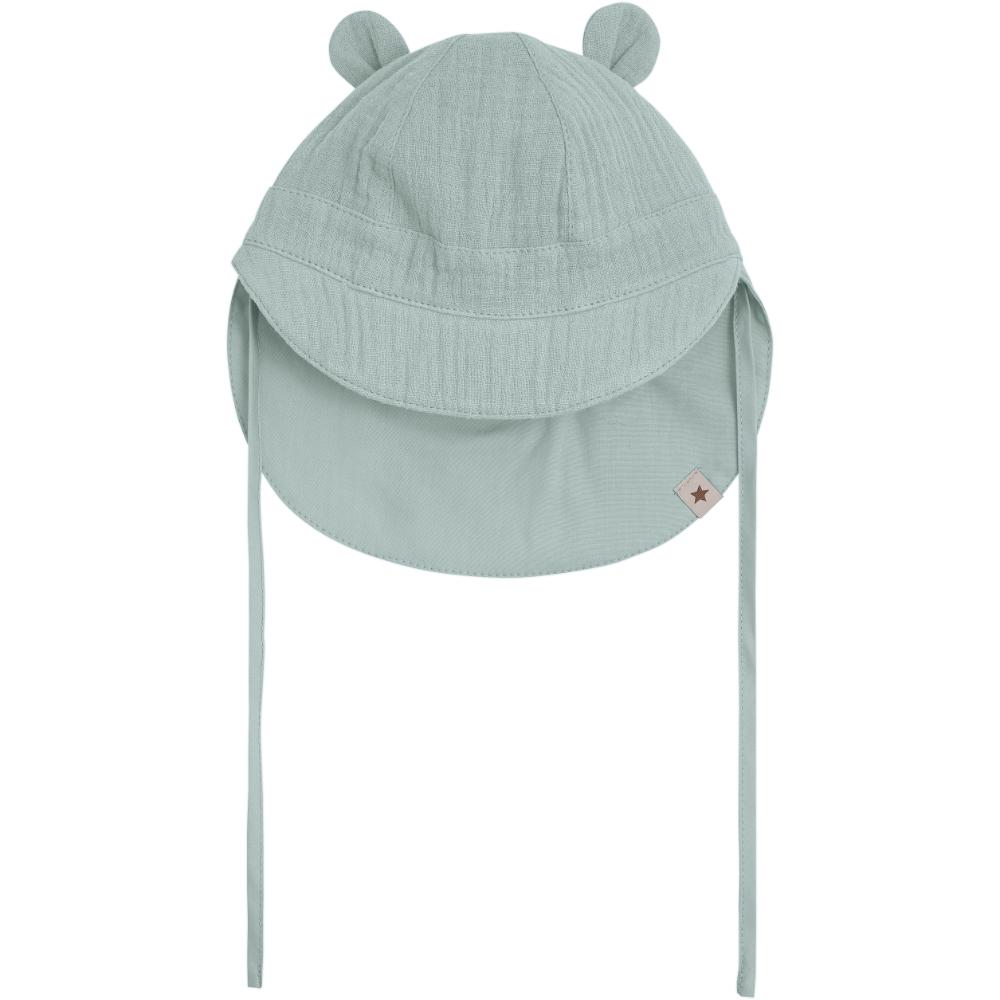 Søt solhatt i myk bomullsmuslin med små bjørneører som gir et lekent uttrykk. Hatten har brem foran og ekstra lengde bak for god solbeskyttelse, samt knytebånd for sikker passform. Perfekt til varme dager med både komfort og solbeskyttelse ☀️
