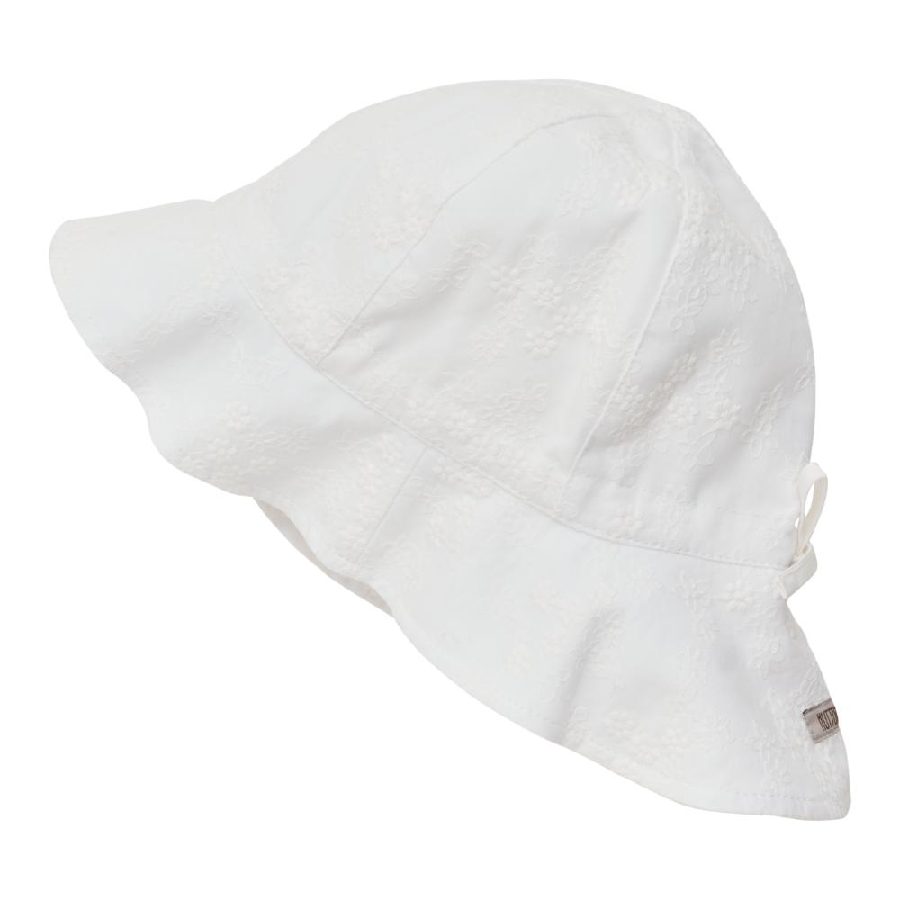 Søt solhatt i bomull med broderidetaljer som gir et lett og sommerlig uttrykk. Hatten har ekstra lengde bak for god beskyttelse og justerbar snøring med sløyfe. Perfekt til solrike dager og god beskyttelse ☀️