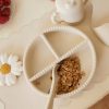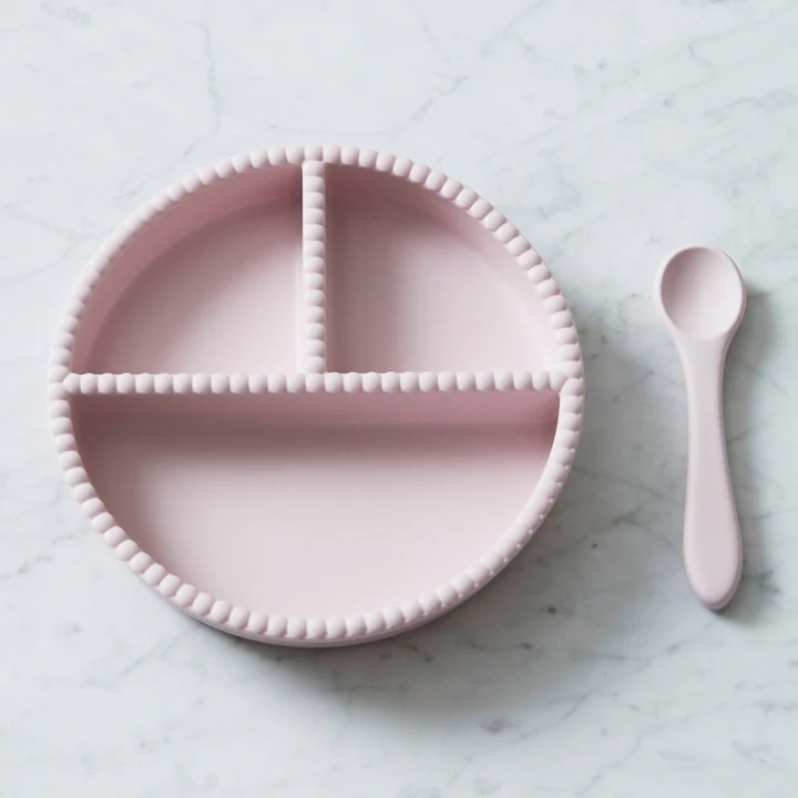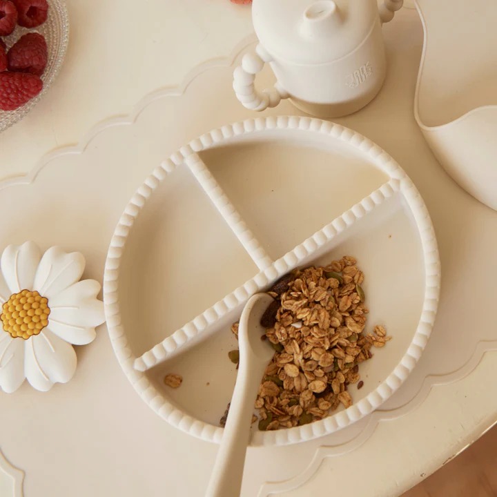 Et smart og holdbart servisesett for barn i alle faser av matreisen – fra introduksjon til mer selvstendig spising. Den delte tallerkenen gjør måltidene ryddige og innbydende, mens sugekoppen reduserer søl. Kombinert med det trygge silikonmaterialet og enkel rengjøring er dette et praktisk og stilrent tillegg til måltidene hjemme eller i barnehagen.