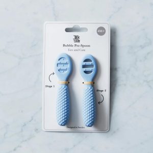 Begge skjeene har små sanseprikker på sidene som gir lett lindring til ømme gommer under tannfrembrudd. Det lekne bobledesignet gjør dem enkle å gripe for små hender.