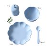 Oppdag et nydelig servisesett til barn, inspirert av blomsterformer. Settet består av tallerken, bolle, kopp og skje – alt designet i myk silikonkvalitet. Tallerken og bolle har sugekopp i bunnen som fester seg til glatte overflater og reduserer søl, perfekt for små barn som lærer å spise selv.