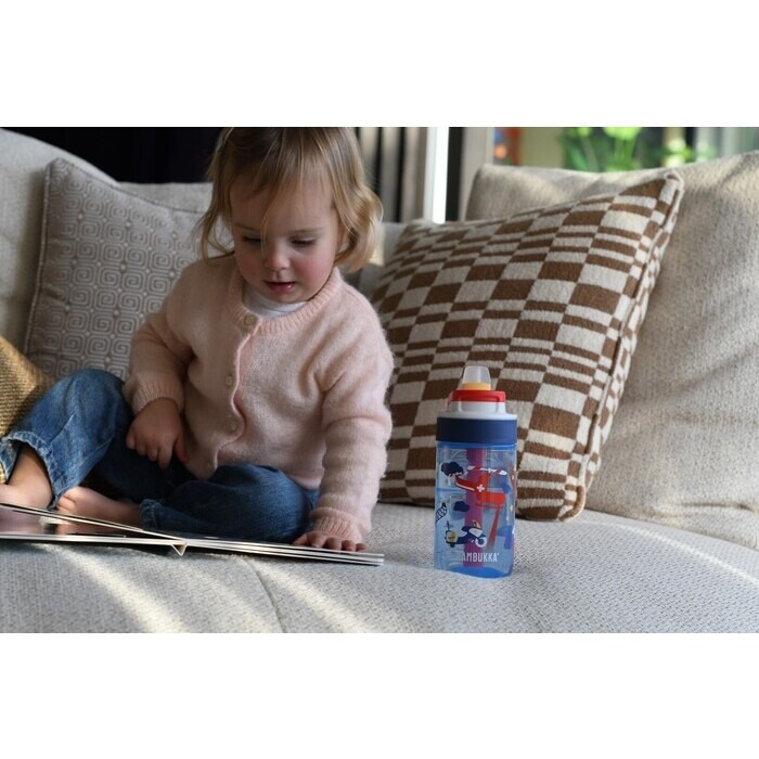 Flasken har et integrert sugerør med et mykt silikonmunnstykke og en praktisk bæreløkke, som gjør det enkelt for barnet å drikke selv – med én hånd! Den er helt lekkasjesikker når lokket er lukket, og tåler oppvaskmaskin. Den ideelle følgesvenn for barnehage, skole og utflukter.