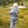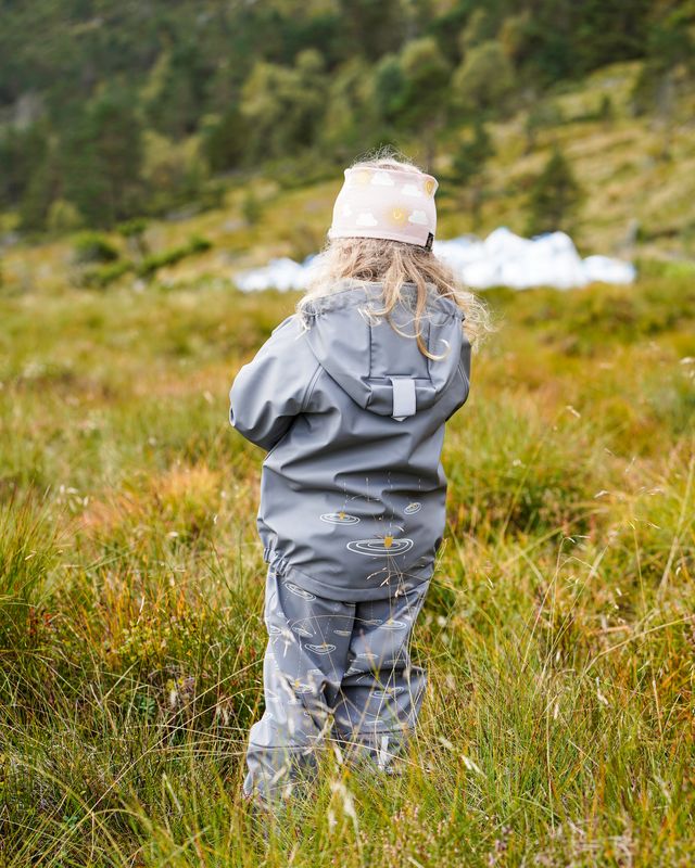 Her har me slitesterk gummistrikk under føtene, refleksar på jakke og bukse, og mykje moro i print og andre detaljar. Sveisa saumar og sikker hette som er både avtagbar og regulerbar.