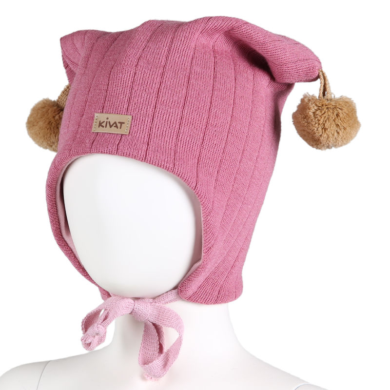 Myk og varm vinterlue med to kamelfargede dusker og KiVAT skinnlogo. Luen dekker ørene godt, har windstopper og knyting under haken.
