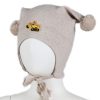 Myk vårlue med to runde dusker. Luen dekker ørene godt, har vindstopper, knyting under haken.