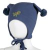 Myk vårlue med to runde dusker. Luen dekker ørene godt, har vindstopper, knyting under haken.