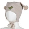 Myk vårlue med to runde dusker. Luen dekker ørene godt, har vindstopper, knyting under haken.