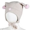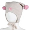 Myk vårlue med to runde dusker. Luen dekker ørene godt, har vindstopper, knyting under haken.